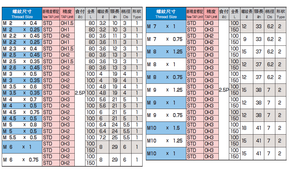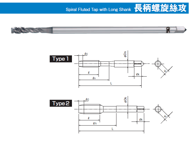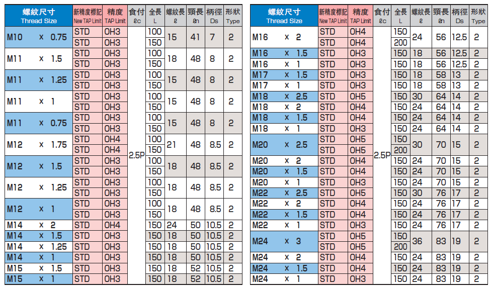 長柄螺旋絲攻 M2*0.4 ~ M24*1