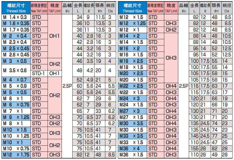 鍍鈦螺旋絲攻 M1.4*0.3 ~ M36*1.5