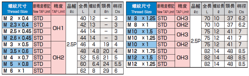 鋁用螺旋絲攻 M2*0.4 ~ M12*1.25