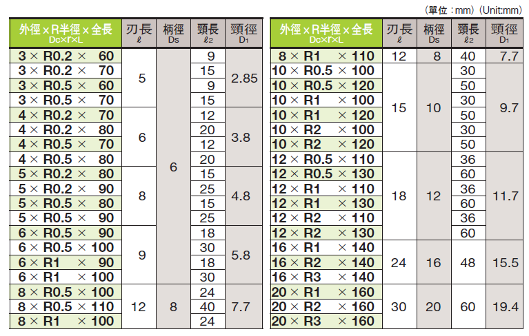 鎢鋼圓鼻刀-強力型 M3*R0.2*60 ~ M20*R3*160