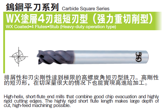 四刃超短刃鎢鋼銑刀-強力重切削型