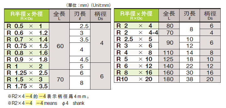 二刃鎢鋼球刀-銅鋁合金塑膠用球刀型 R0.5*1 ~ R10*20