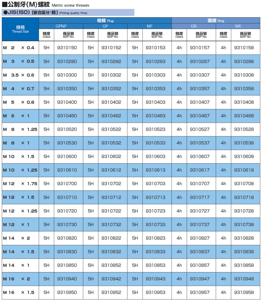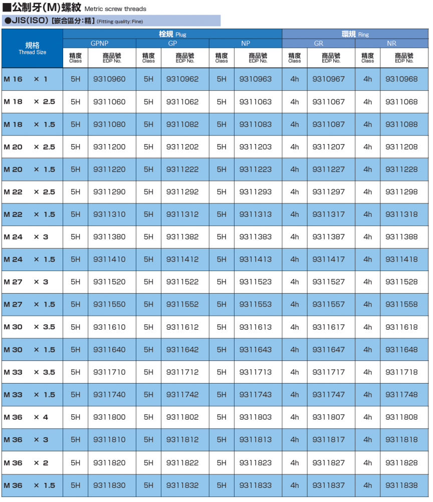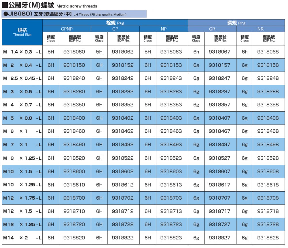 螺紋用限界量規 左牙 M1.4*0.3 ~ M30*1.5 M2*0.4 ~ M36*1.5